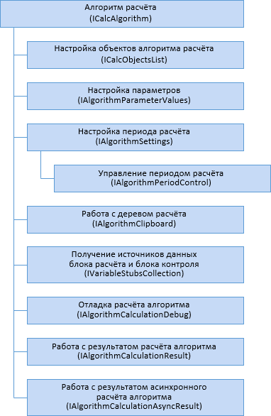Для работы с алгоритмом расчёта предназначен интерфейс ICalcAlgorithm, который взаимодействует с другими интерфейсами с помощью свойств и методов.