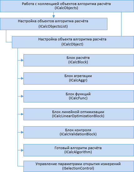 Для работы с объектами алгоритма расчёта предназначен интерфейс ICalcObjects, с помощью которого можно получить конкретный объект и изменить его параметры. Также интерфейс является родителем интерфейса ICalcObjectsList, с помощью которого можно добавлять, копировать, сортировать и удалять объекты алгоритма расчёта.