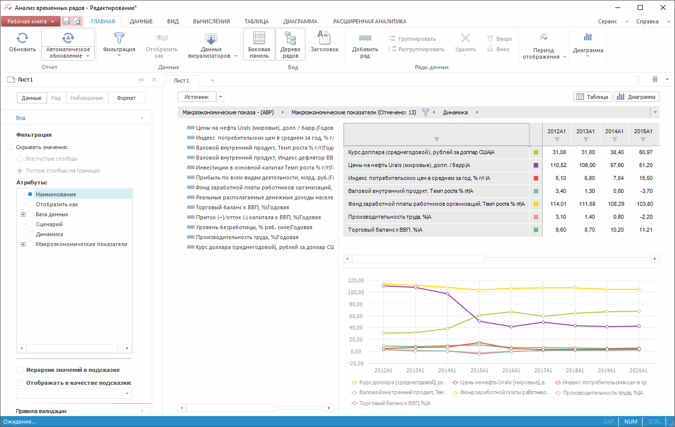 Инструмент «Анализ временных рядов» предназначен для исследования данных, изменяющихся во времени, и позволяет размещать временные ряды на едином табличном пространстве с возможностью объединения и графического представления, выполнять проверку качества данных для моделирования и фильтровать временные ряды, а также выполнять построение новых временных рядов с помощью разнообразных моделей: математические формулы, экстраполяция, факторный анализ и т.д.