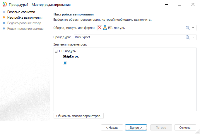 В списке доступных будут процедуры и функции без параметров или с параметрами простых типов. Кнопка «Обновить список параметров» позволяет обновить список доступных параметров в соответствии с сигнатурой выбранной процедуры/функции. Для каждого параметра будет доступен редактор, позволяющий задать значение. Значения параметров будут переданы в процедуру/функцию при выполнении.