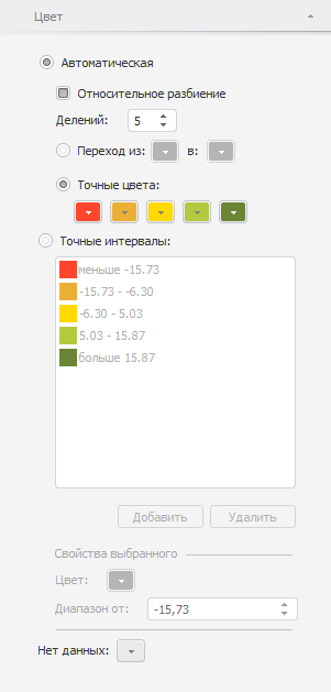 Заливка карты рассчитывается по цветовой шкале. Шкала задаёт набор числовых интервалов и способ заливки для каждого интервала.