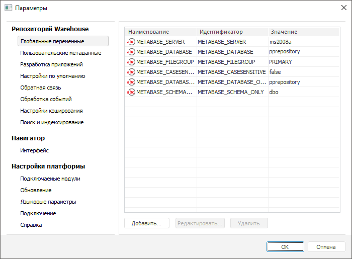 METABASE_FILEGROUP. Значение переменной соответствует пользовательской файловой группе базы данных сервера MSSQL. Переменная отображается, если в настройках репозитория указан тип СУБД MSSQL.