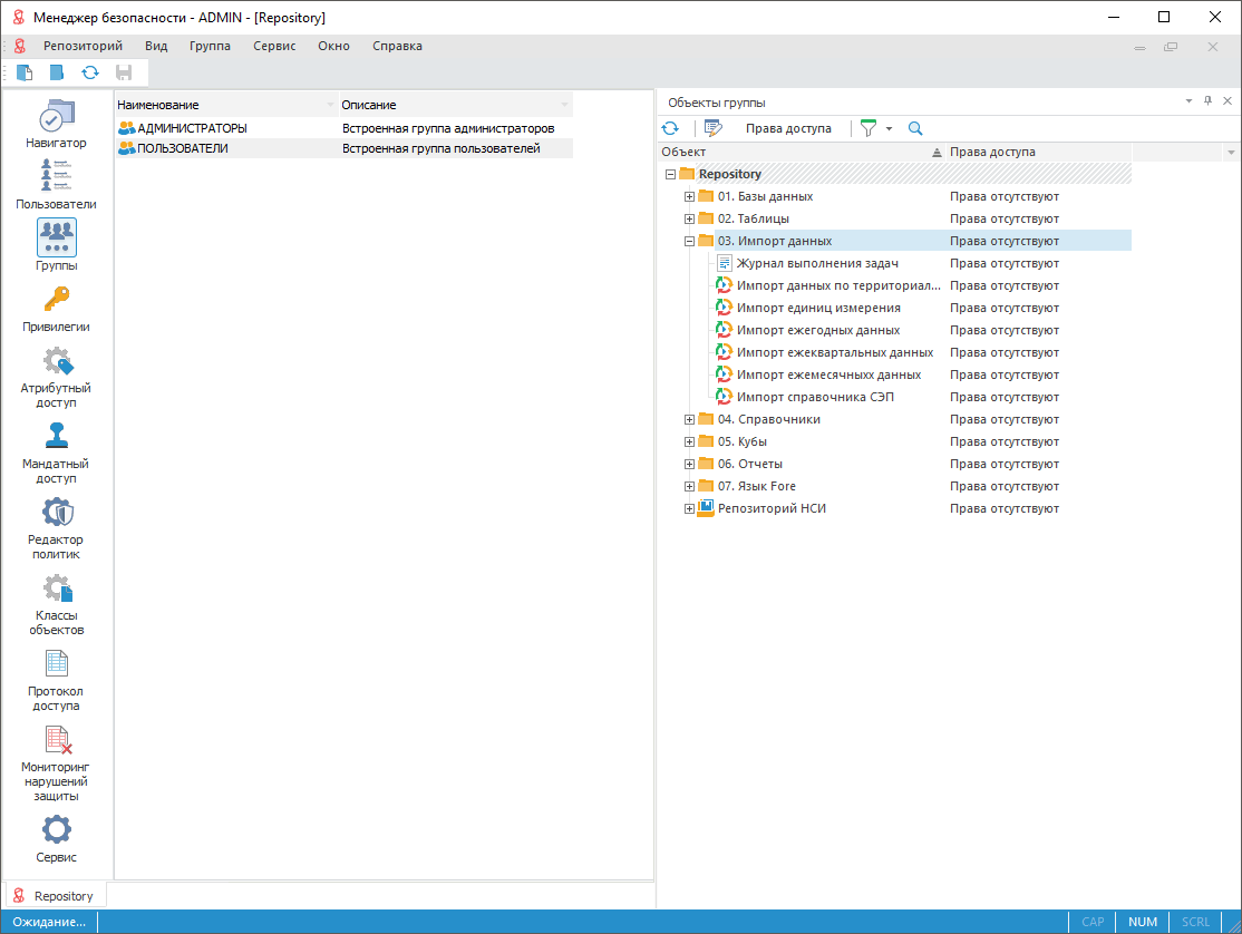 Примечание. При разделении ролей между администратором информационной безопасности и прикладным администратором раздел «Группы» будет доступен только администратору информационной безопасности.