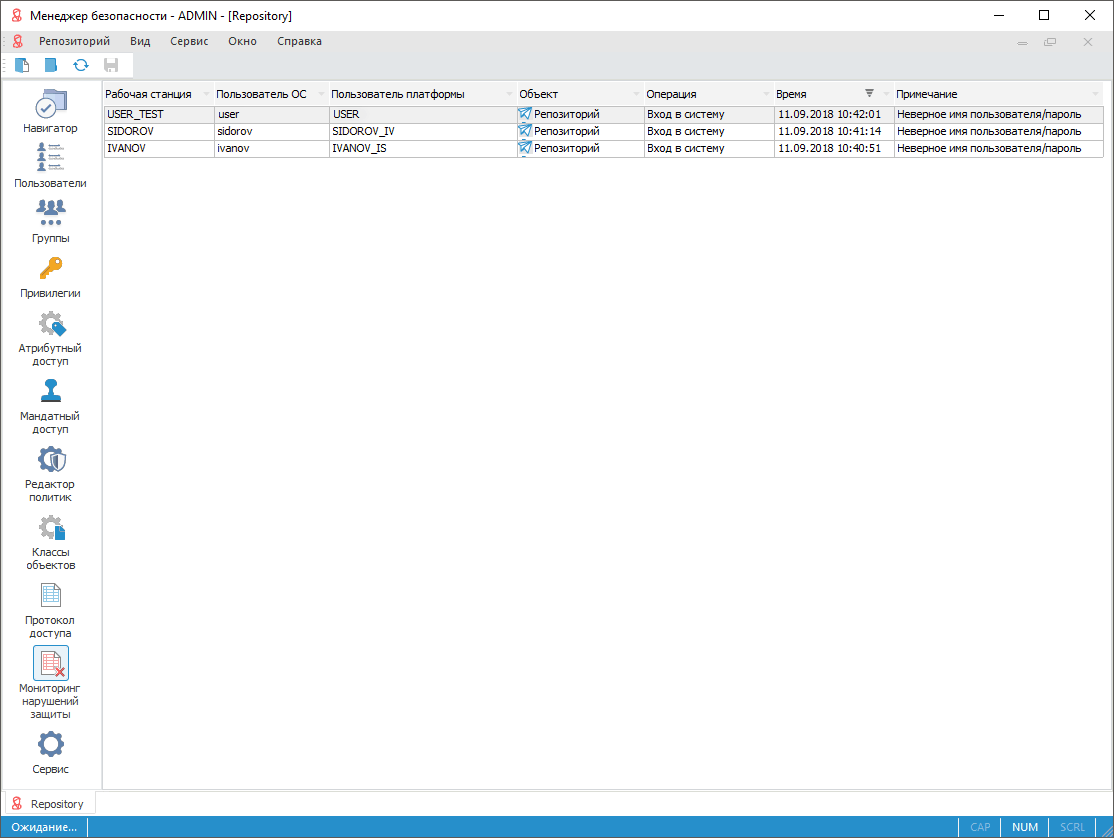 Менеджер безопасности проверяет права доступа пользователя и фиксирует нарушения защиты при неудачном входе в систему и недоступном действии над объектом.