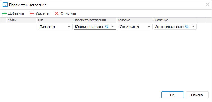 Примечание. Доступно только для типа условия «Параметр». Набор отображаемых типов условия зависит от параметра или типа данных его атрибута, выбранного в столбце «Параметр ветвления».