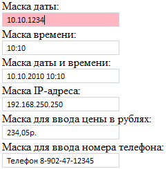 После выполнения примера на html-странице будут размещены редакторы с шаблонами для ввода даты, времени, даты и времени, ip-адреса, цены в рублях и номера телефона c установленными значениями. Если попробовать ввести в редактор значение, не соответствующее регулярному выражению, то загорится индикатор некорректного ввода: