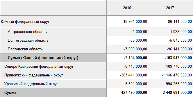 Для строк и столбцов таблицы можно настроить отображение итоговых значений. Например, выводить сумму значений в столбцах.