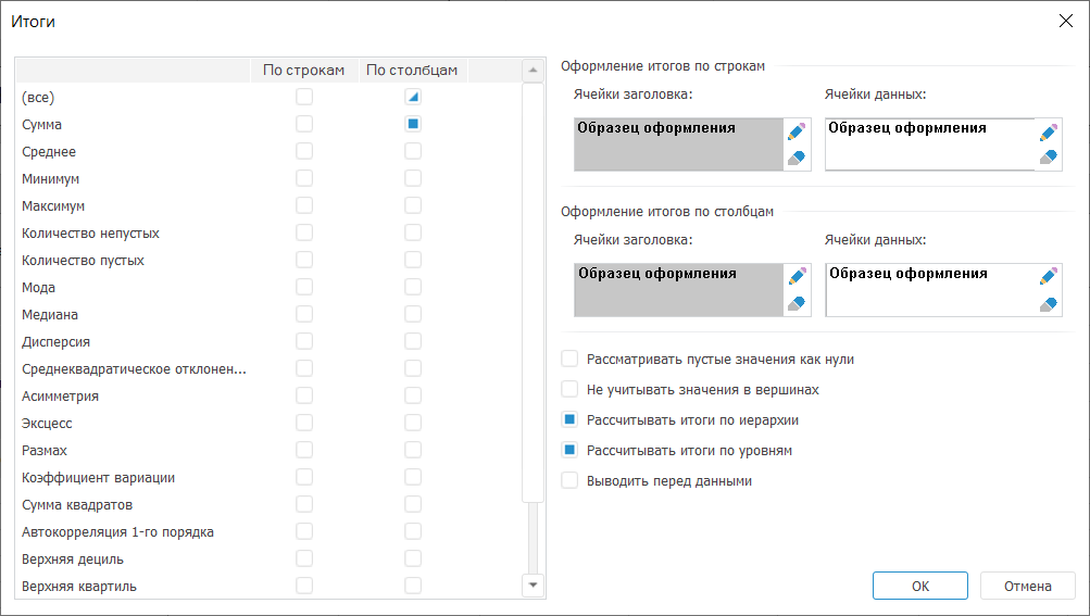 Для настройки дополнительных параметров итоговых значений используйте окно «Итоги».