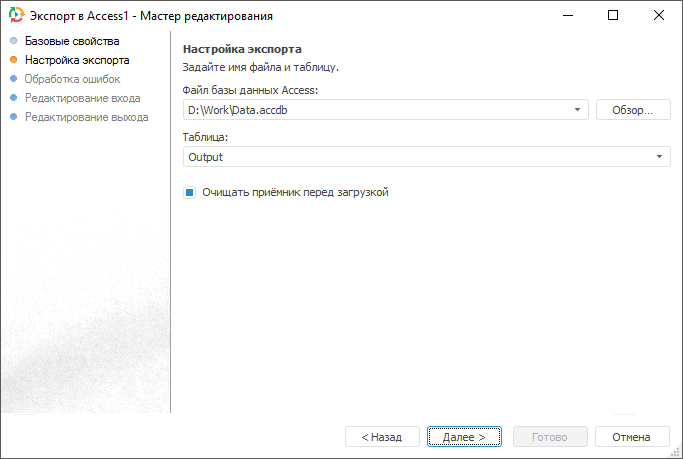 На странице «Настройка экспорта» указывается файл базы для экспорта данных.