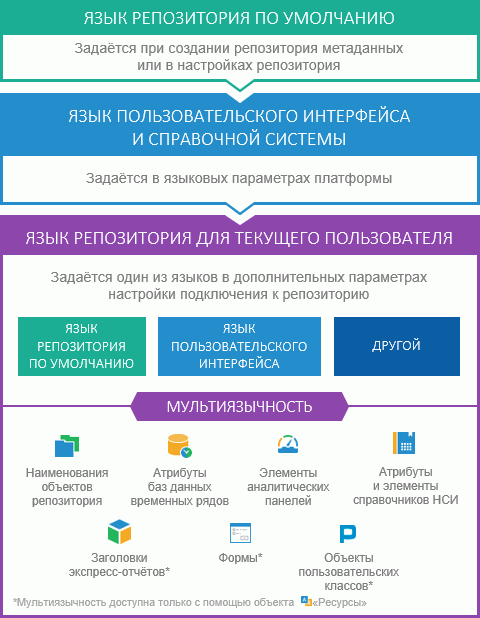 Мультиязычность объектов репозитория зависит только от языка репозитория для текущего пользователя. Язык интерфейса задается независимо от языка репозитория для текущего пользователя и может отличаться.