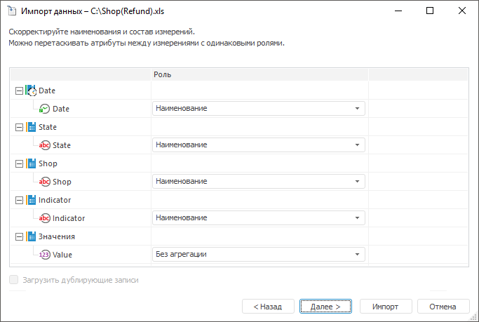 Для настройки списка измерений и их состава перейдите на данную страницу мастера импорта данных: