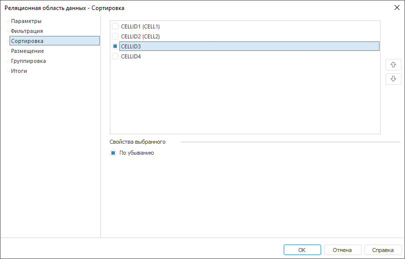 На данной вкладке установите флажки напротив идентификаторов столбцов, в которых необходимо настроить сортировку данных. Для ячеек, привязанных к источнику, после идентификатора в скобках указано наименование. После этого становится доступным установка флажка «По убыванию». Установите его, если требуется отсортировать данные по убыванию.