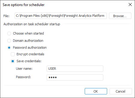 In the dialog box that opens select password authorization and determine user name and password to start Foresight Analytics Platform. Save scheduler settings to the file by clicking the OK button.