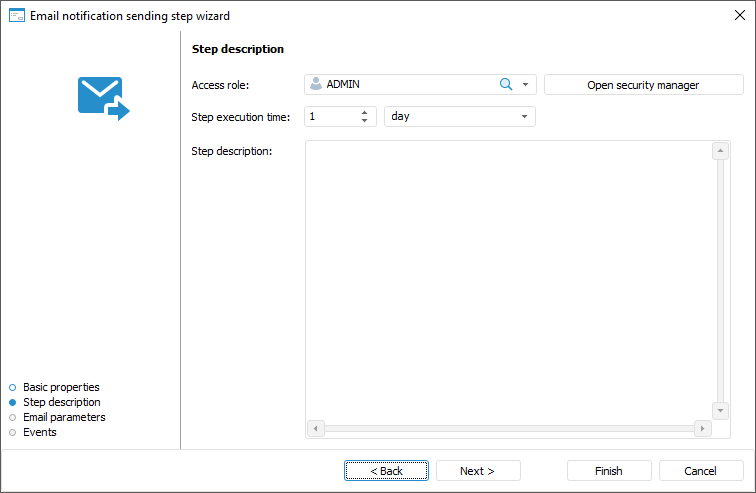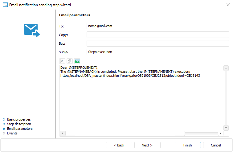 To create a step that generates automatic email notifications, open the send email notification step wizard.