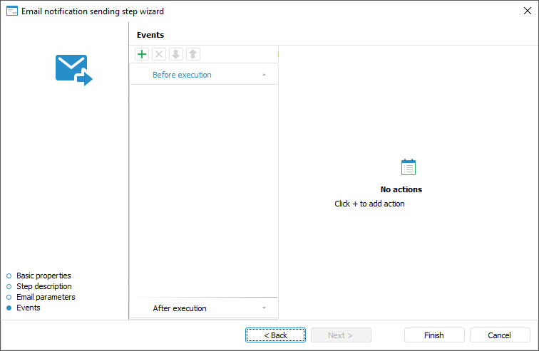 Set up automatically executed actions started when one of the events is occurred: step execution start, step execution finish and step rejection.