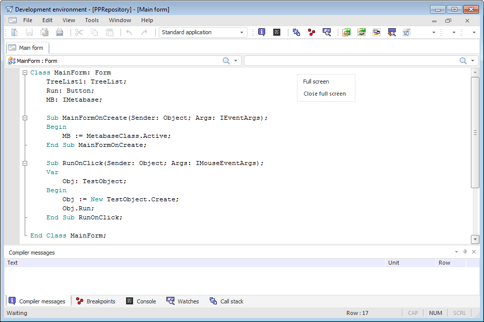 When the text is of the big amount, the Full Screen Mode is available in the development environment for a better viewing. This mode hides all service windows of the development environment. The macro window is expanded to the full screen. The main menu, drop-down lists for code navigation, toolbars and the Full Screen panel that used to return to normal size are displayed.