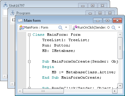The development environment window contains a set of panels that are used to create and set up user forms, units and assemblies and their .NET equivalents. Name of the development environment main window contains repository name and name of currently opened object.