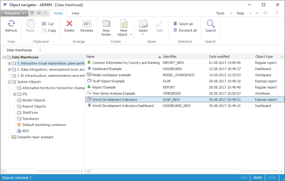 A repository object is an object having a special set of characteristics and specific structure and usage. In Foresight Analytics Platform objects are used for working with separate data types or executing typical tasks. Object examples are tables, dictionaries, cubes, reports, and so on.