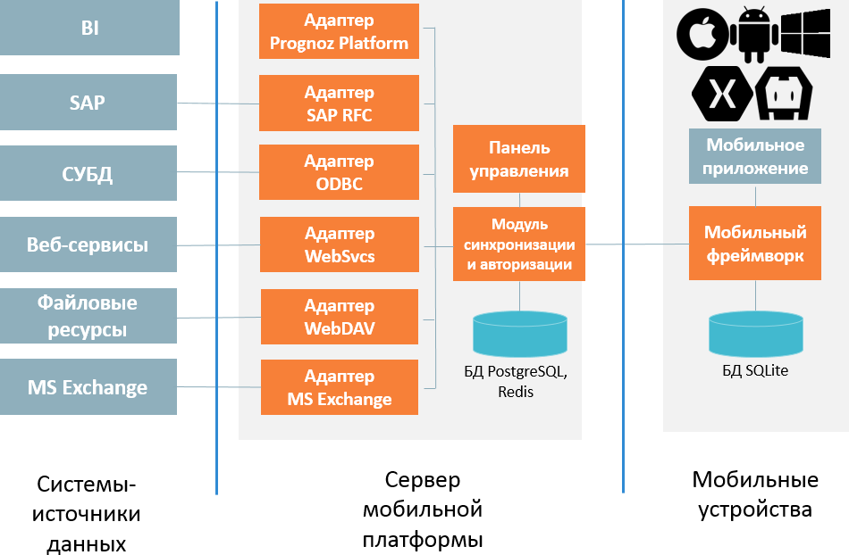 Functional architecture of the product is based on connecting data sources to mobile platform server and synchronization with mobile devices via mobile application framework.