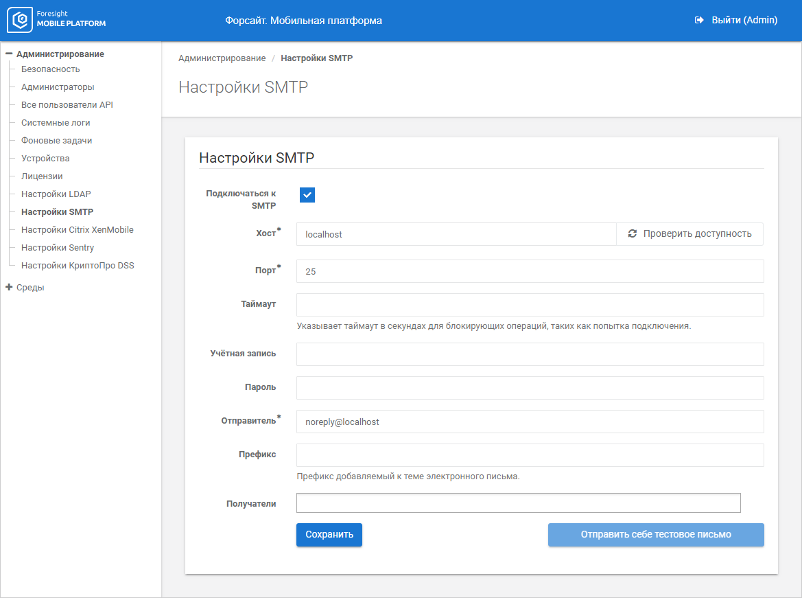 Click the Save button to save SMTP server connection parameters.