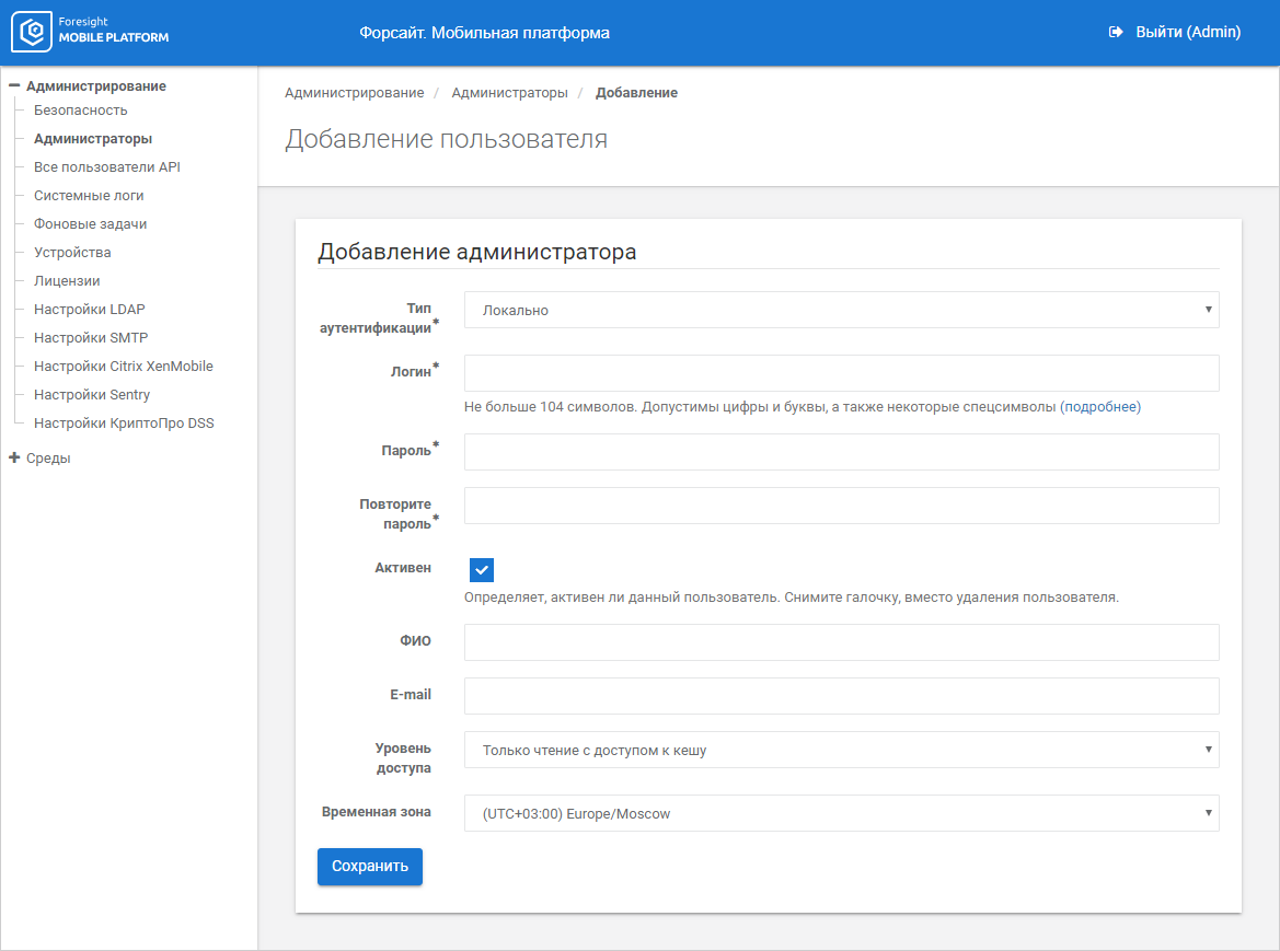 The working area displays a list of existing administrators with access level and other parameters.