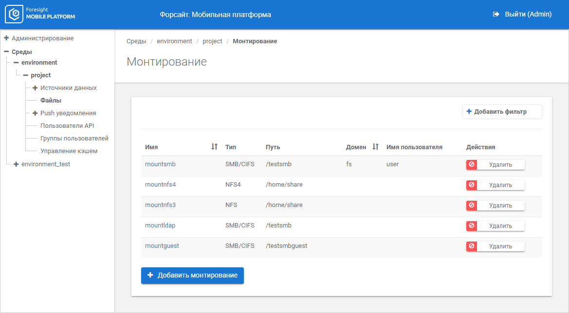 Imported file resources. File resources at the file server that is used to exchange, store and protect data. Mounting contains settings of connection to a file server folder and provides mobile platform connection to server without creating web services on the data source side.