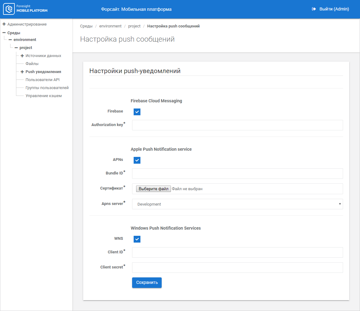 Set up push notifications by selecting the checkbox next to the used type of OS: