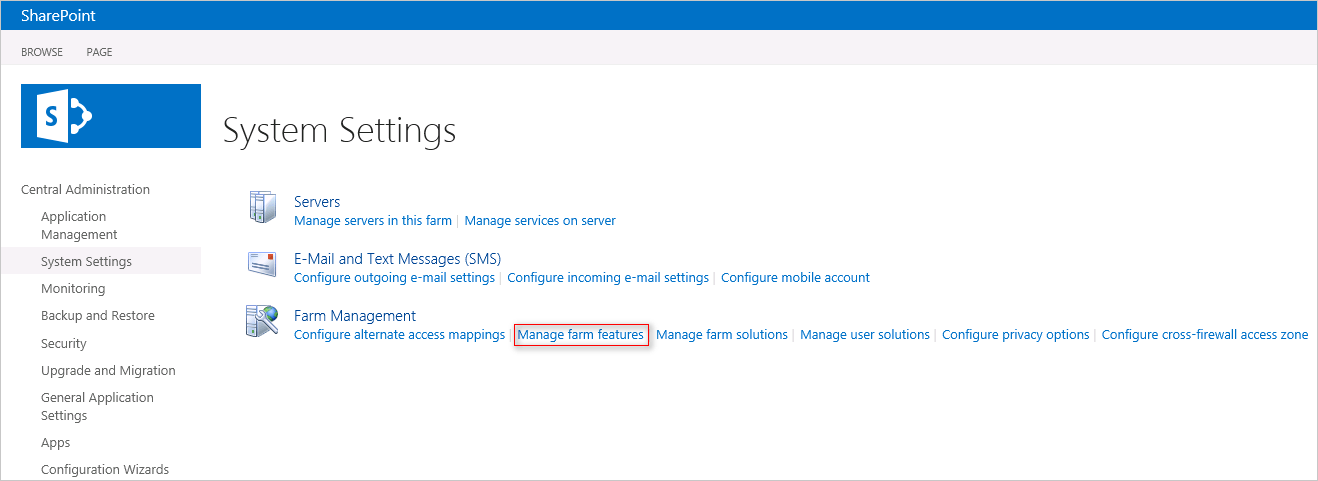 Start the Microsoft SharePoint 2013 Administration Center (Start > Microsoft SharePoint 2013 Products > SharePoint 2013 Administration Center) and go to the System Settings section.