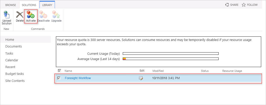 To activate the solution, enter <portal URL>/_catalogs/solutions/Forms/AllItems.aspx in the browser address bar. The page for working with solutions opens. Select the Foresight.Workflow solution in the list and click the Activate button on the Solutions ribbon tab: