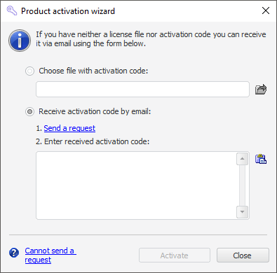 The activation wizard prompts two methods of product activation: by using a license file or by an activation code obtained by email.