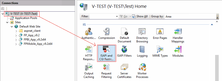 Select the root element of the Connections tree, double-click ISAPI and CGI Restrictions: