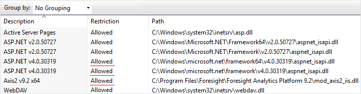 For the ASP.NET v4.0.30319 and Axis2 v9.2 x64 strings the Restriction column must display Allowed: