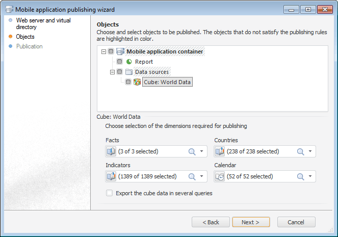 By default, the selection in cube dimensions or a time series database corresponds to the selection in all dimensions of reports included in the published mobile application container. If required, change the selection of dimensions elements.