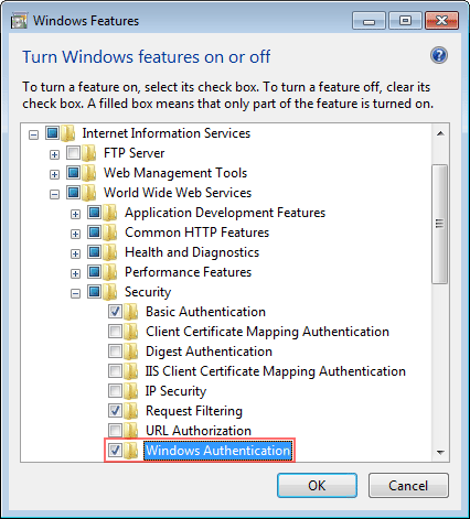 Authentication in the list of functions, select the Windows Authentication checkbox and disable other settings.