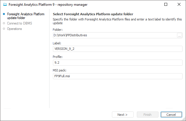IMPORTANT. To copy the MSI distribution file version, create a PPUPDATE user. The schema of this user will store Foresight Analytics Platform distribution file, and it will be taken from this schema on update.