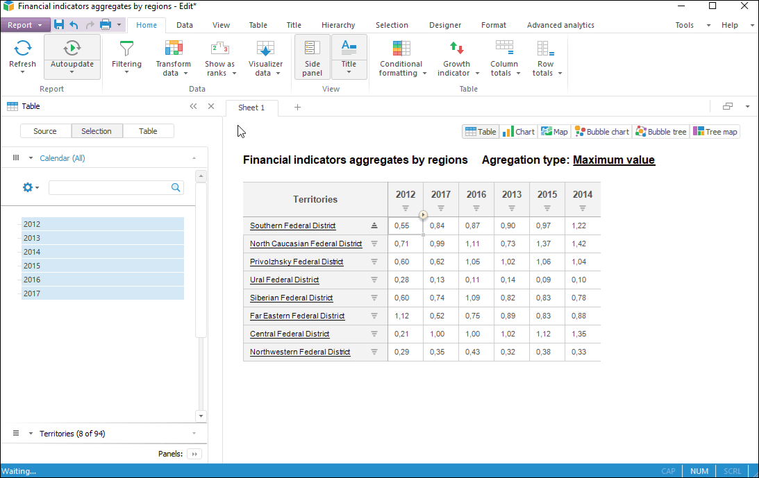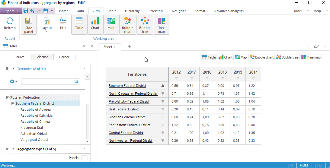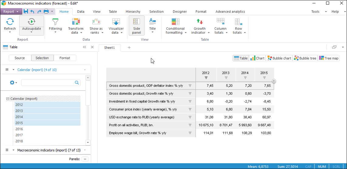 If fixed dimensions aggregation it is possible to execute drill down by aggregated elements. As a result, fixed dimension becomes a dimension in rows, displaying all elements that are used to get aggregated data. To drill down the cells, which data was obtained by fixed dimensions aggregation: