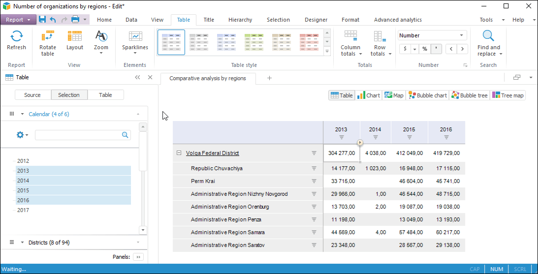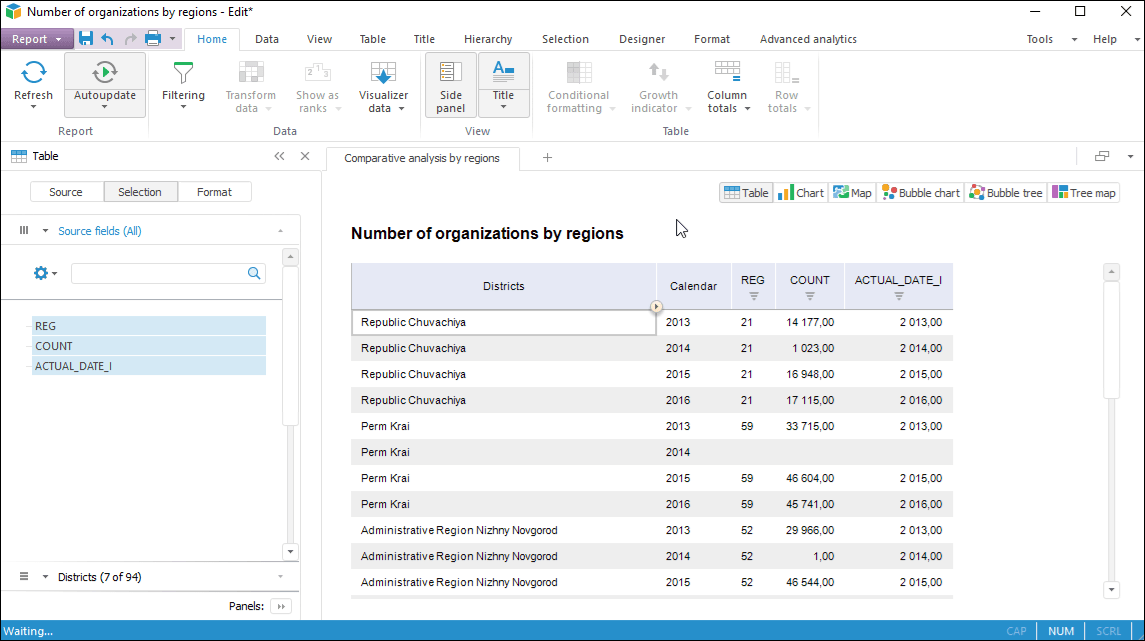 Data drill down and drill up is an operation that enables the use of navigating data levels: from general to particular ones and vice versa. Available drill down depth is determined by the hierarchy of the data source dimensions. On drilling down aggregated fixed dimensions it is possible to see elements used for data aggregation.