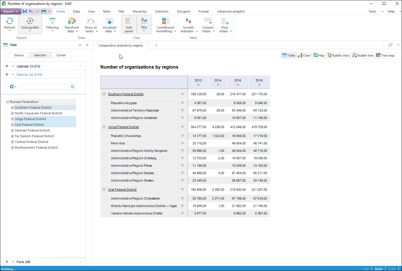 1. Select the Column Totals item on the Home ribbon tab, select the Sum item in the drop-down menu. After the step is executed, the table will contain hierarchy totals - Amount (District), level totals - Amount (level) and the grand total. Data from table is summed in the row cells.