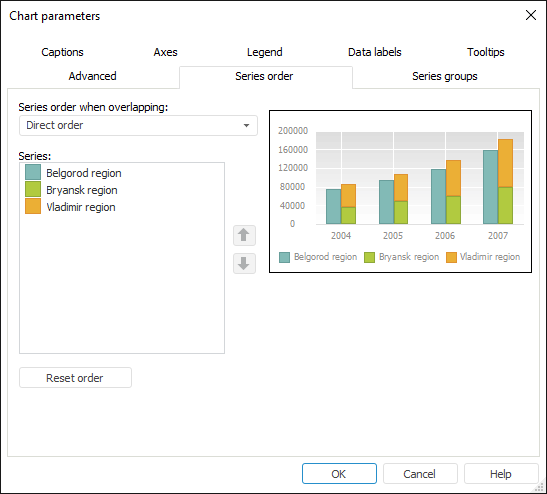 To set up the order, in which the data series appear on the chart, go to the Series Order tab of the Chart Parameters dialog box.
