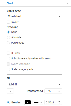 NOTE. On setting transparency of solid or gradient fill, take into account that 100% corresponds to full transparency (data chart background becomes invisible), 0% corresponds to full opacity.