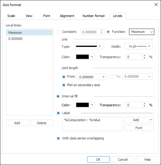 To set up a level line, use the Levels tab of the Axis Format dialog box.