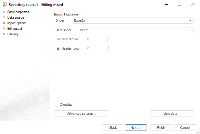 For the Document objects, to which external files with data will be loaded (for example, Microsoft Excel file), the Import Options additional page will be available instead of the Options button.