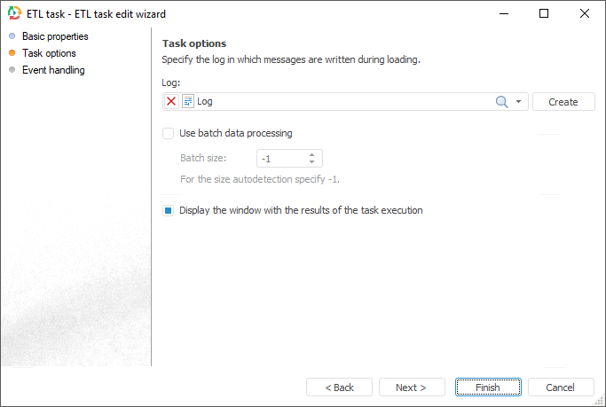 For logging the operations, specify a log in the ETL task properties.