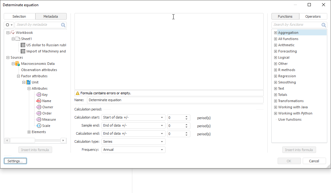 The example is used to create an expression by means of functions and operators. Indicator's annual values in roubles and US dollar rate are used to calculate indicator value in US dollars and is interpolated to the semi-annual frequency: