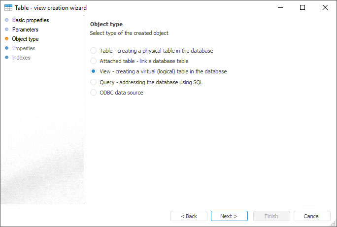 A table creation wizard opens after executing one of the operations. On the Basic Properties determine object name and identifier. On the Object Type page, select created object type in the list - View: