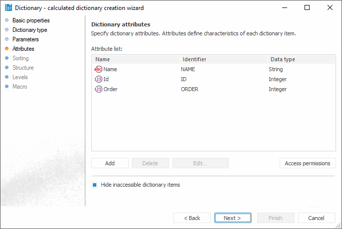 Table Dictionary. The dictionary is used for structured presentation of elements without the ability to add or edit them. To create a dictionary, a table data set or MDM dictionary is required. Each data source record is a dictionary element that must contain definitions of all dictionary elements. The user can use various filters to limit the amount of data, which is moved to the dictionary. A table dictionary can manage contents by means of parameters, that is, it is a dynamic dictionary. It can be created in any place of the repository: