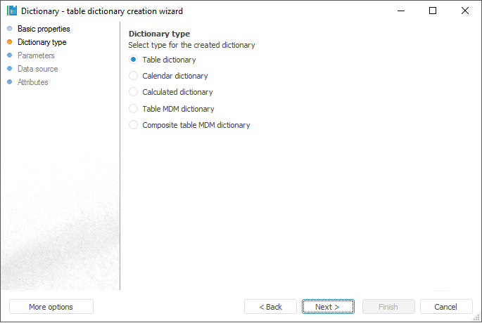 NOTE. Dictionaries can be created only in the desktop application. In the web application, it is possible to work only with table MDM dictionaries and composite table MDM dictionaries.