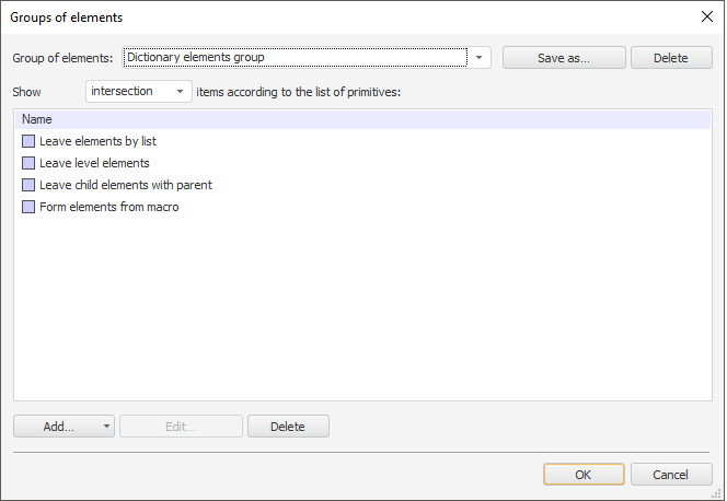 A group of elements is a repository object used in dictionaries to limit the list of available elements. Groups of elements are created as dictionary children and are not shown in the object navigator.
