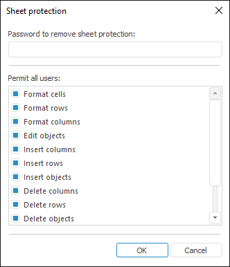 In the dialog box that opens, select the operations the user can execute with a sheet. Select a checkbox to enable the operation. All checkboxes are selected by default. Deselect a checkbox to prohibit an action.