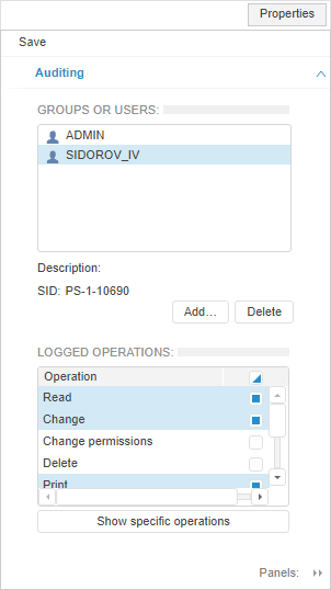 NOTE. Auditing setup for specific operations is available for the object types, for which specific operations are assumed. The list of specific operations differs for different types of objects.